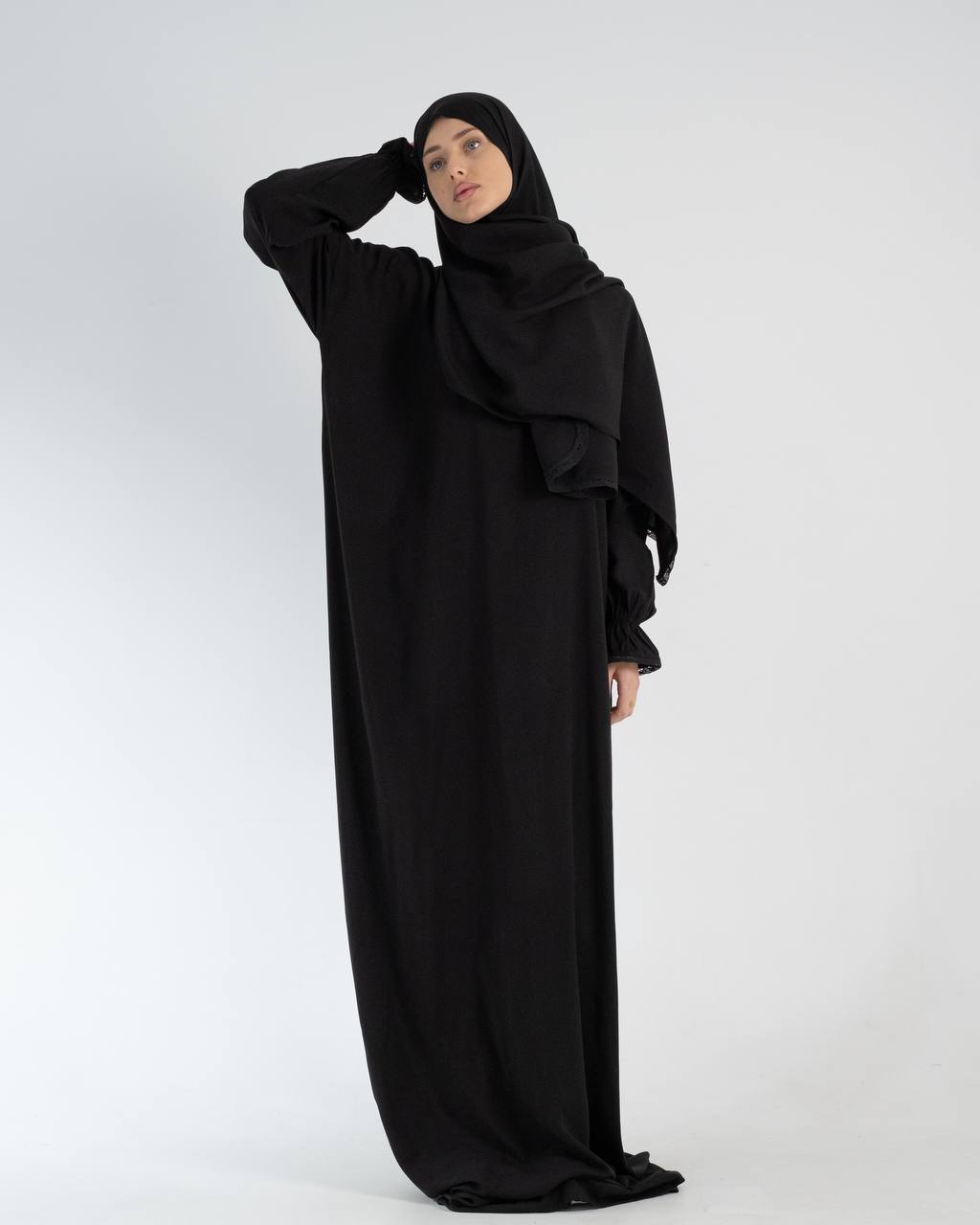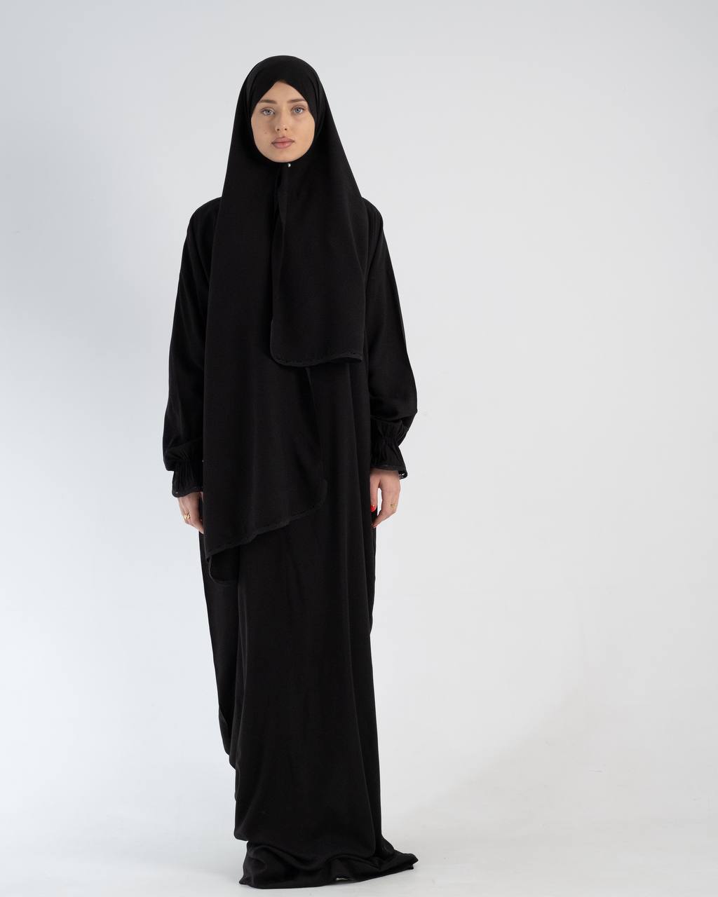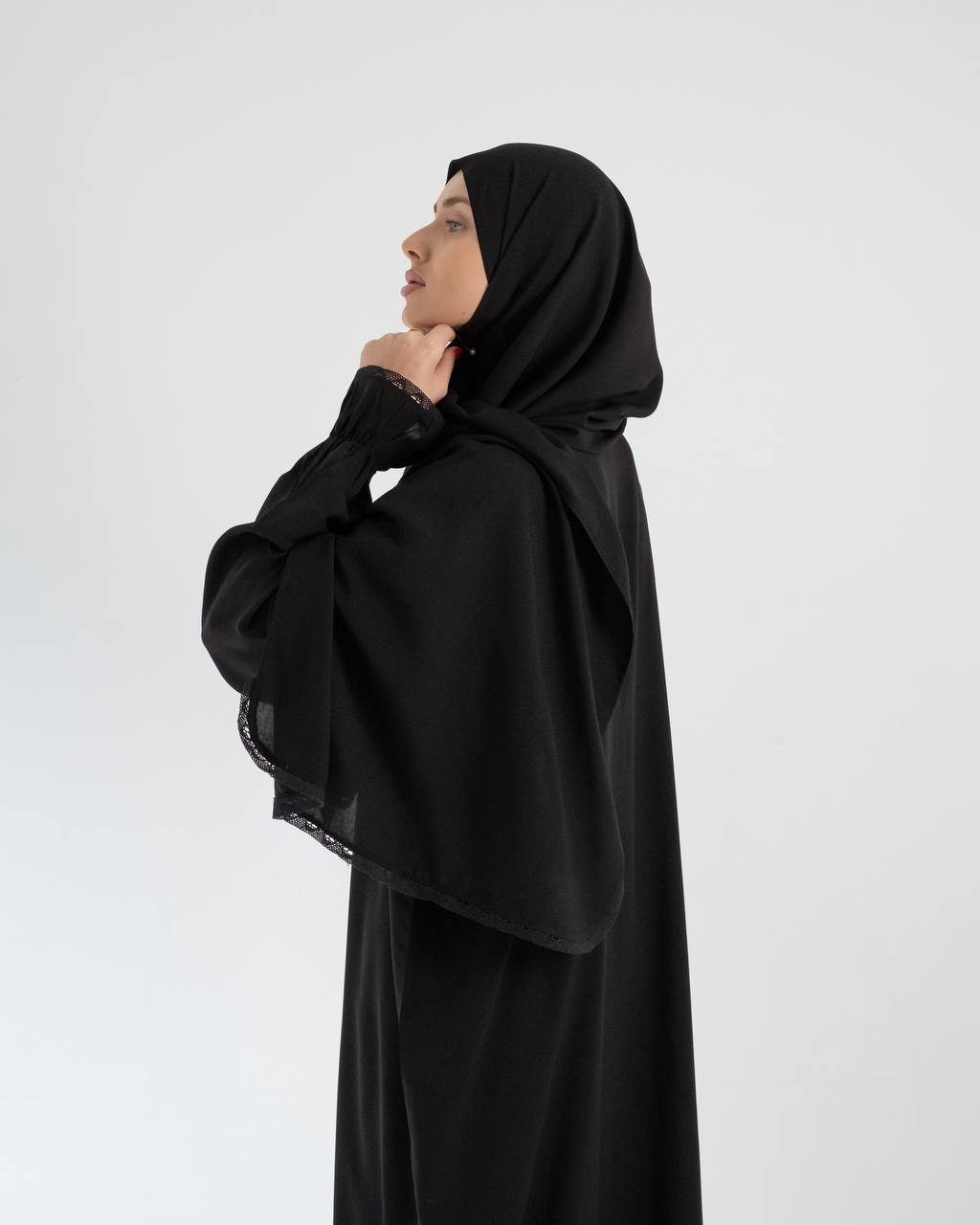 намазное платье с пришитым шарфом, правая сторона шарфа длинная - левая короткая, шарф имеет шов по левому боку. Размеры шарфа 190 / 55 см.
